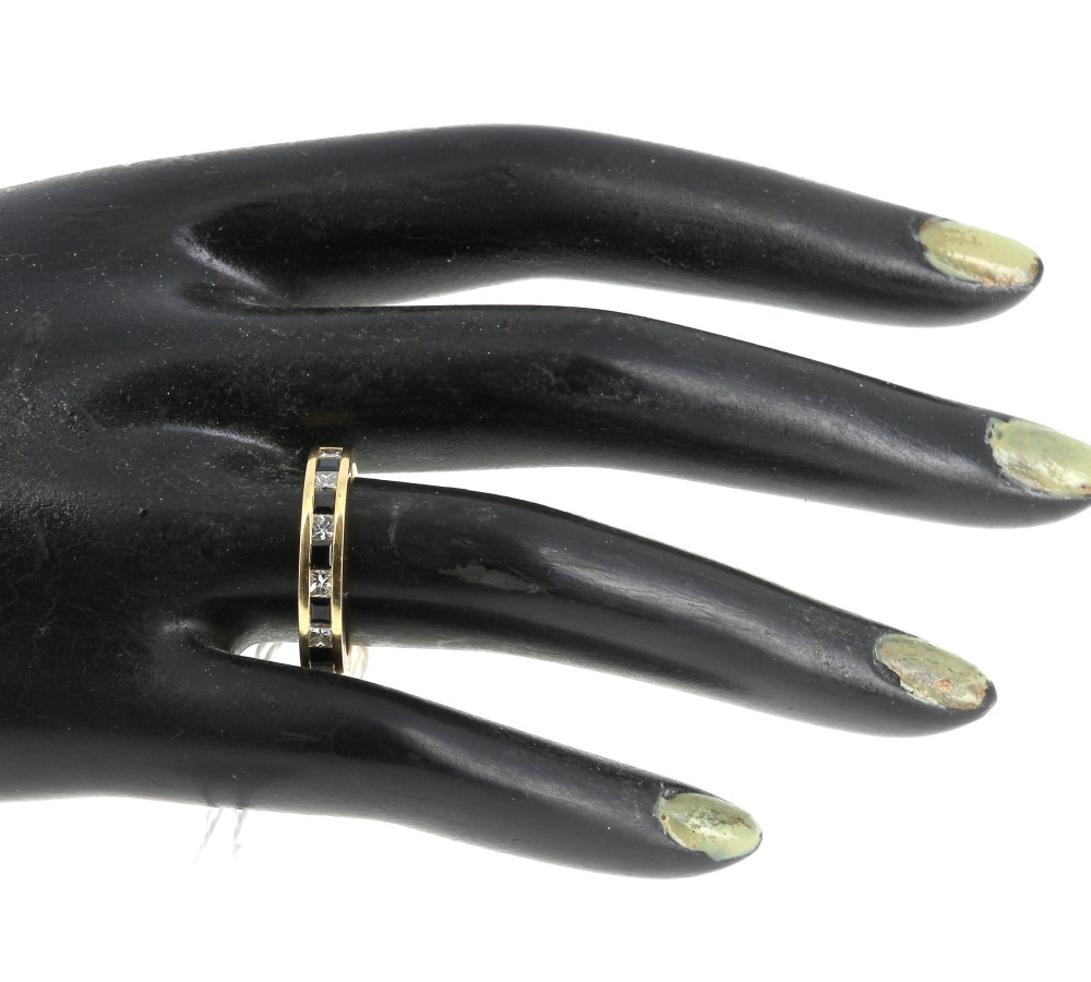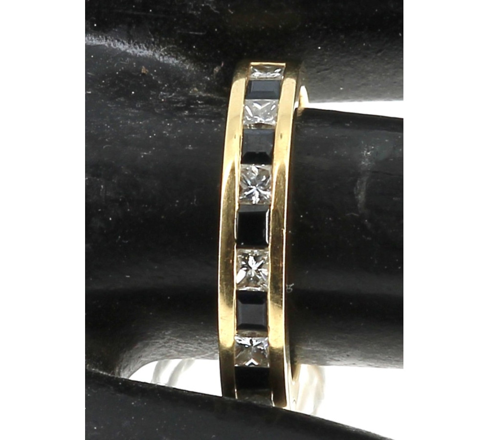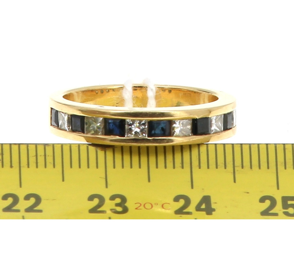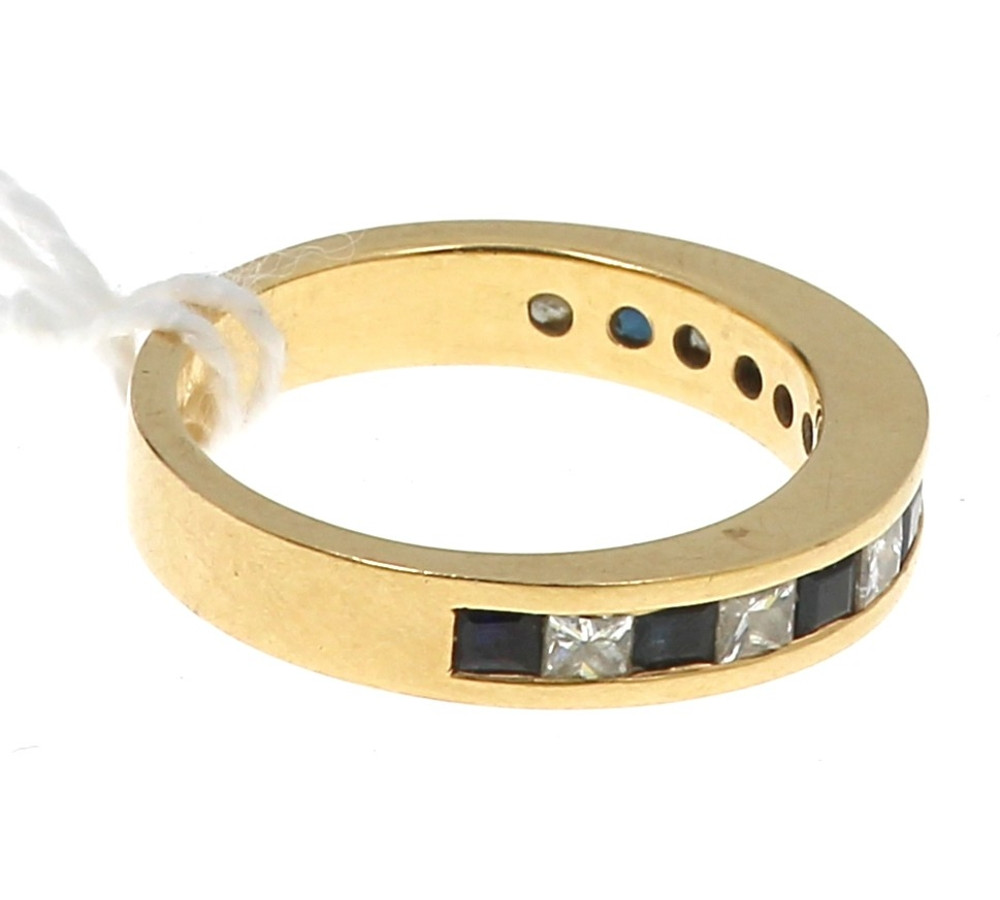 Demi alliance en or jaune, poinçon tête d'aigle, sertie de 7 saphirs et de 7 diamants calibrés en serti rail, poids brut 7 grs. TDD 57