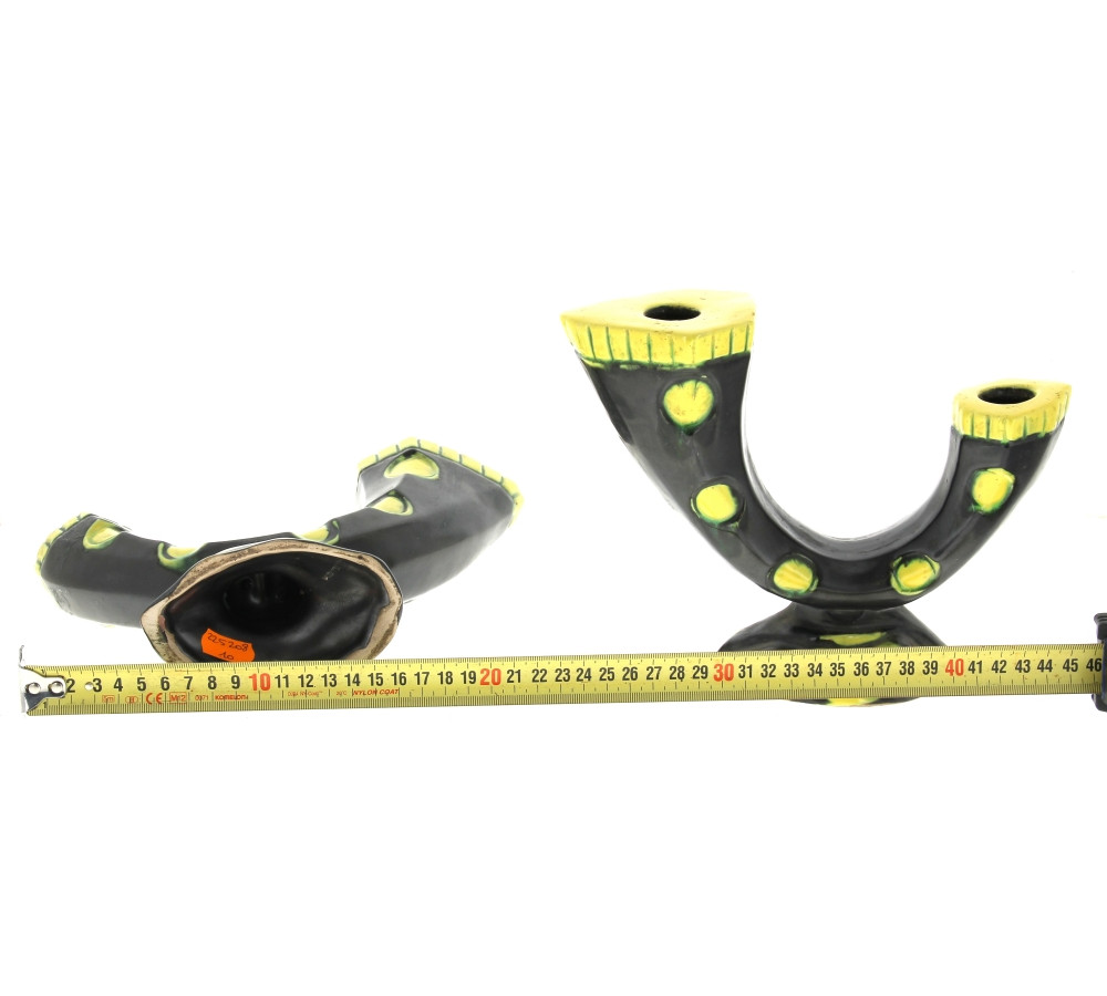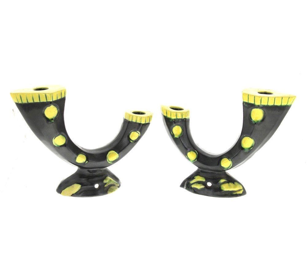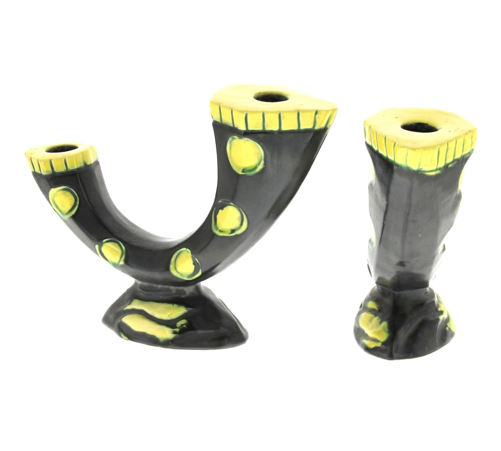 Paire de bougeoirs style Vallauris, en céramique années 50/60 émaillée noir et jaune (petit fêle sur l'un : troués pour être électrifiés). H 17,5 x L 24 cm