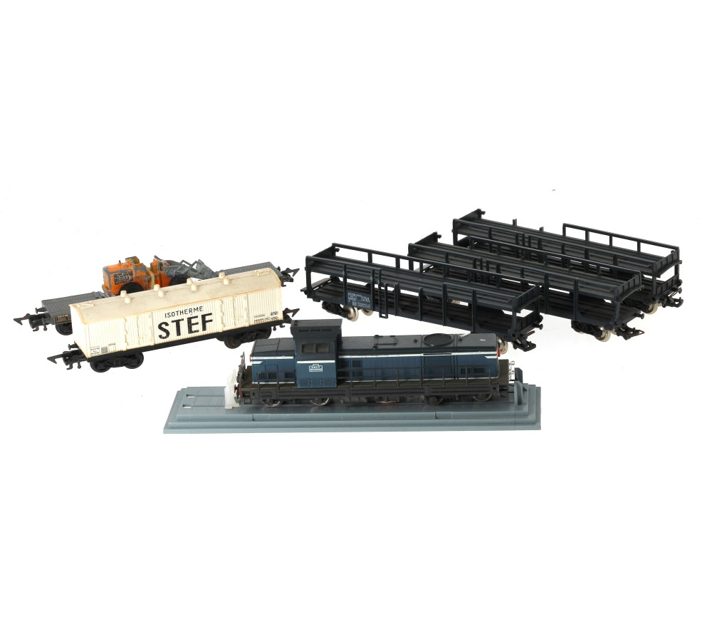 JOUEF Ho - Lot comprenant une locomotive diésel BB66150 + 3 wagons porte-véhicules + plateau + fourgon Stef