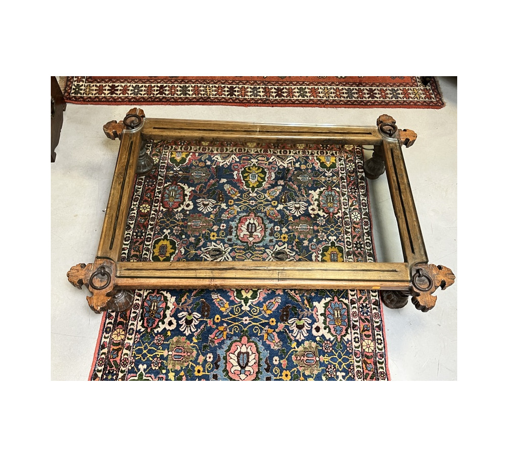 Table basse indienne en bois et fer forgé, plateau en verre épais, 87 x 126 cm