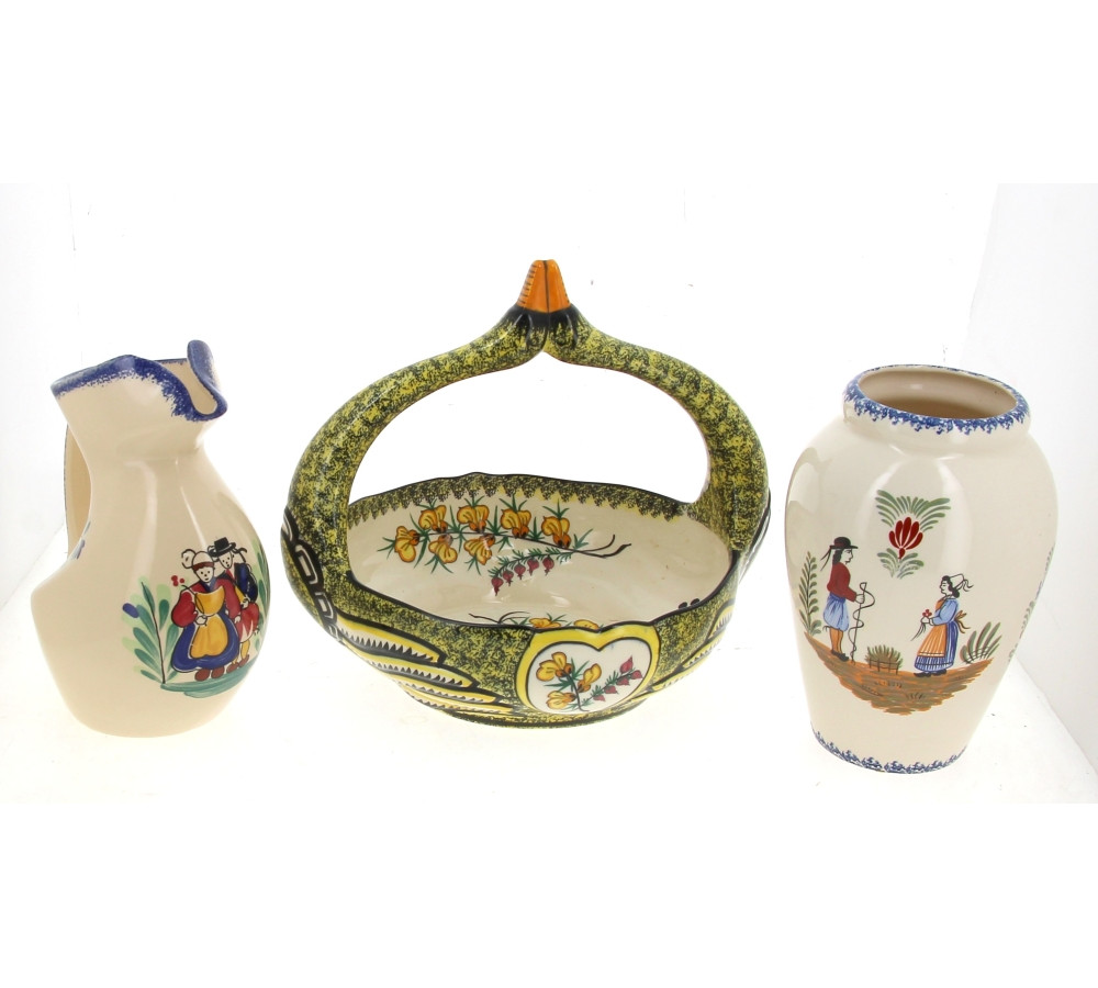 HENRIOT Quimper - Coupe à fruits à anse cols de cygne en faïence polychrome à décor genêt, bruyère, motifs noirs à l'éponge sur fond jaune : on y joint un vase et un pichet décor breton imprimé dans le goût de Quimper