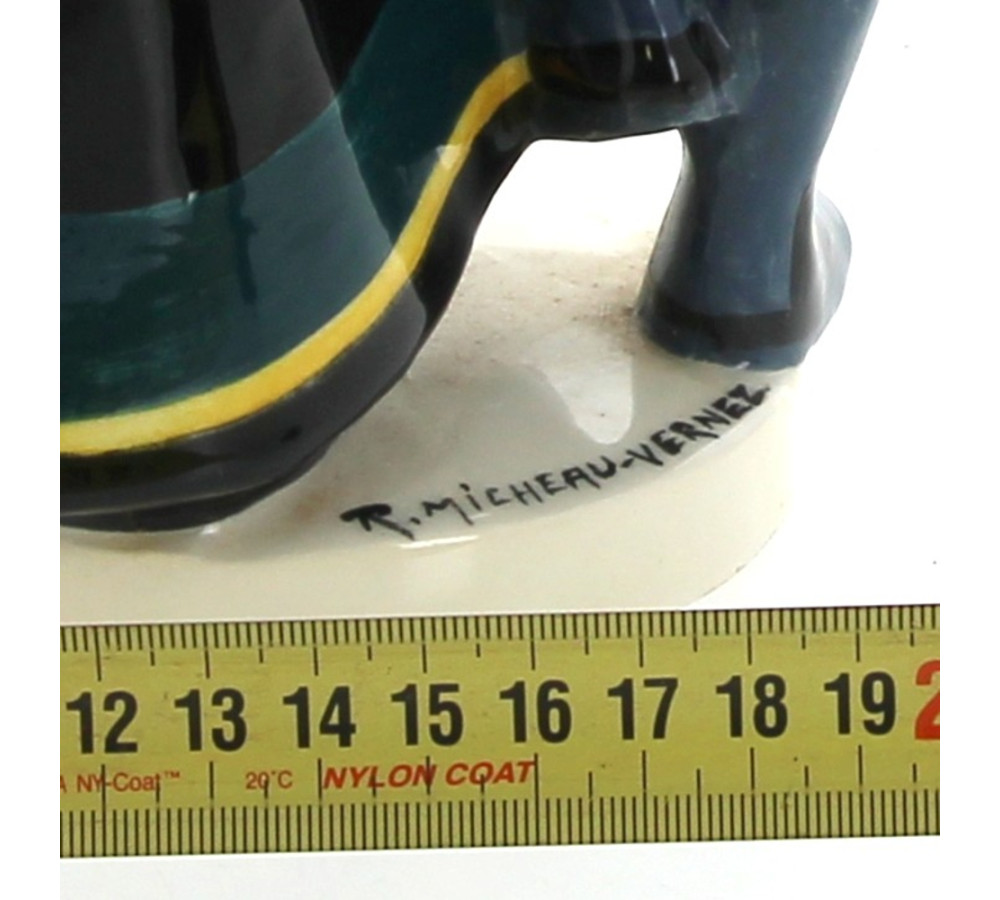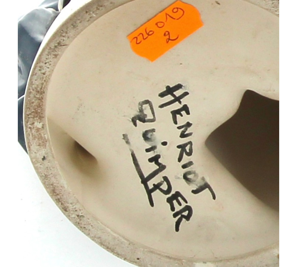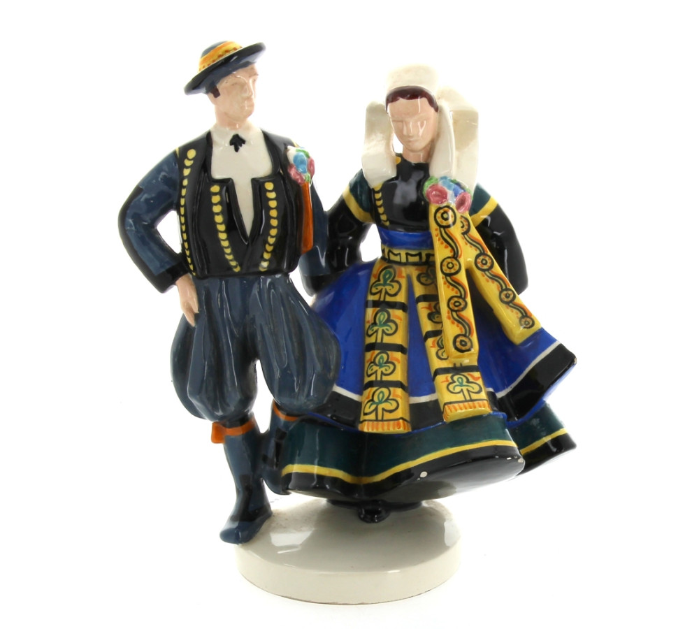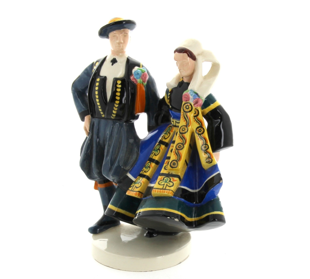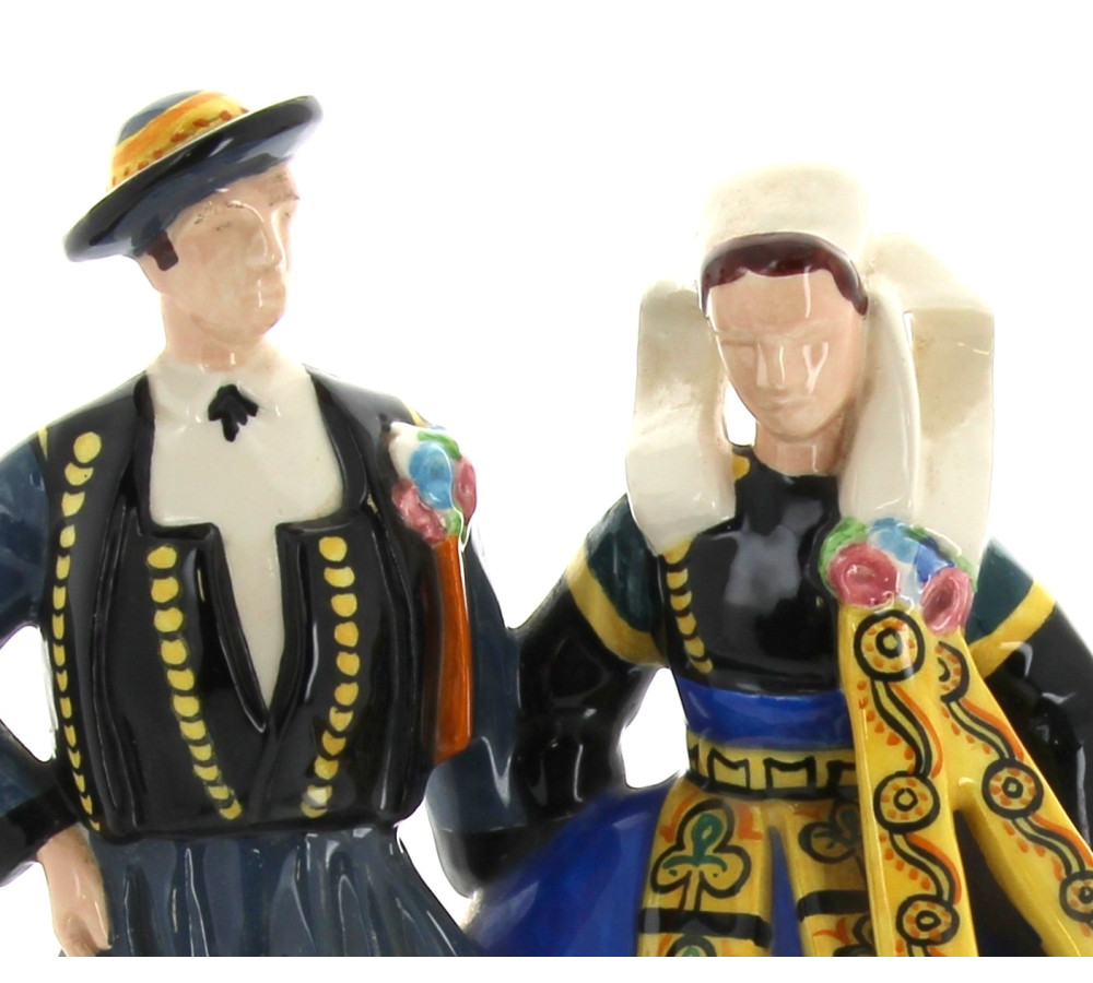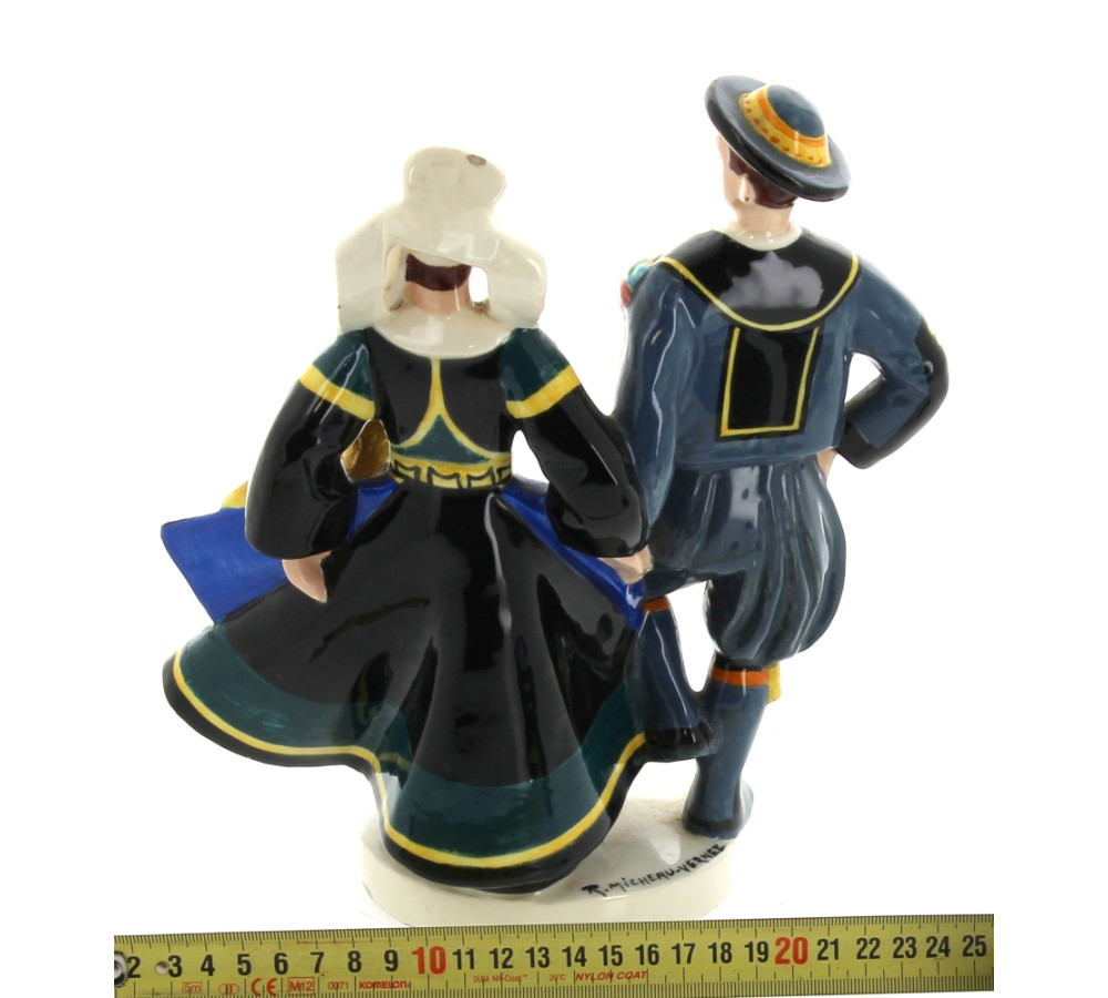 Robert MICHEAU-VERNEZ pour HENRIOT Quimper - Couple de danseurs, sujet en faïence polychrome (petits éclats et sauts d'émail sur le tablier et la robe). H 24,5 cm