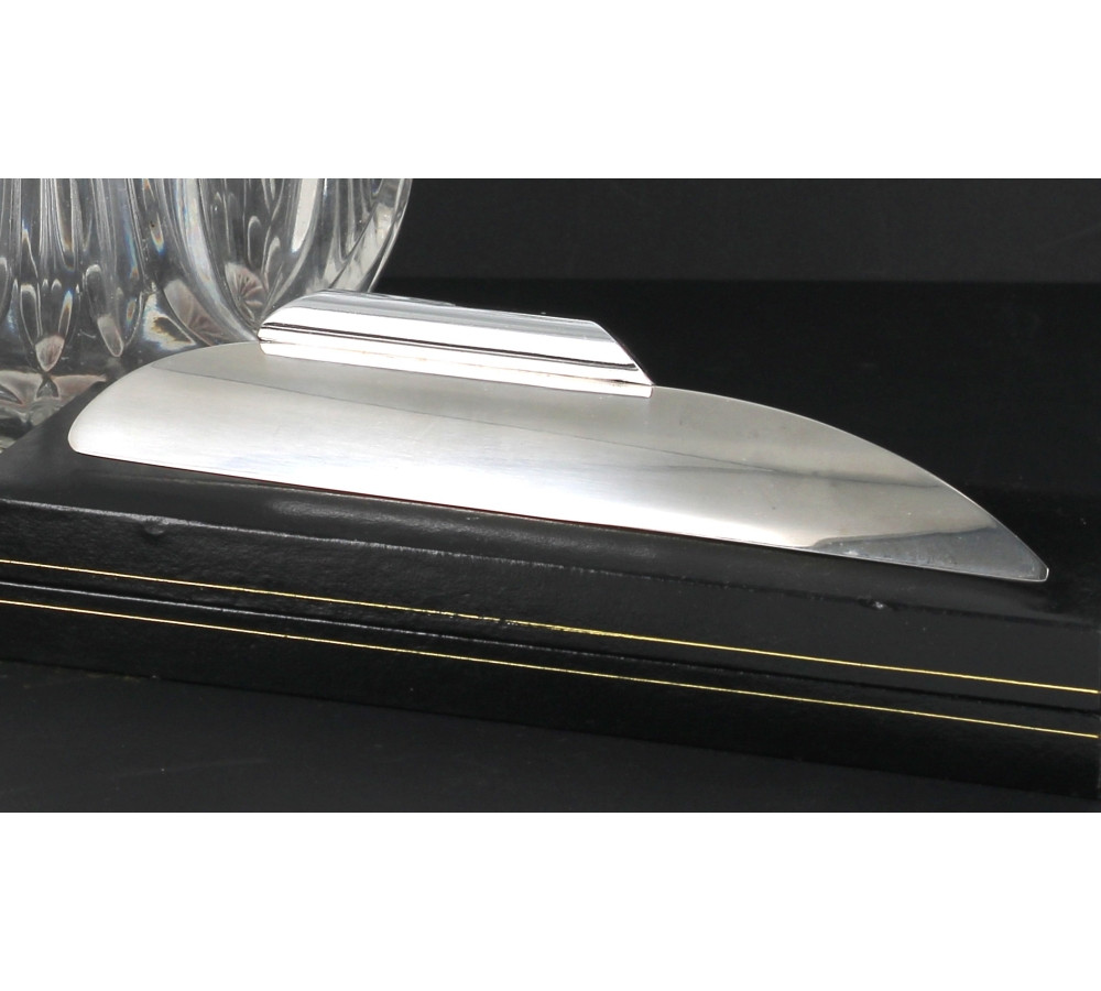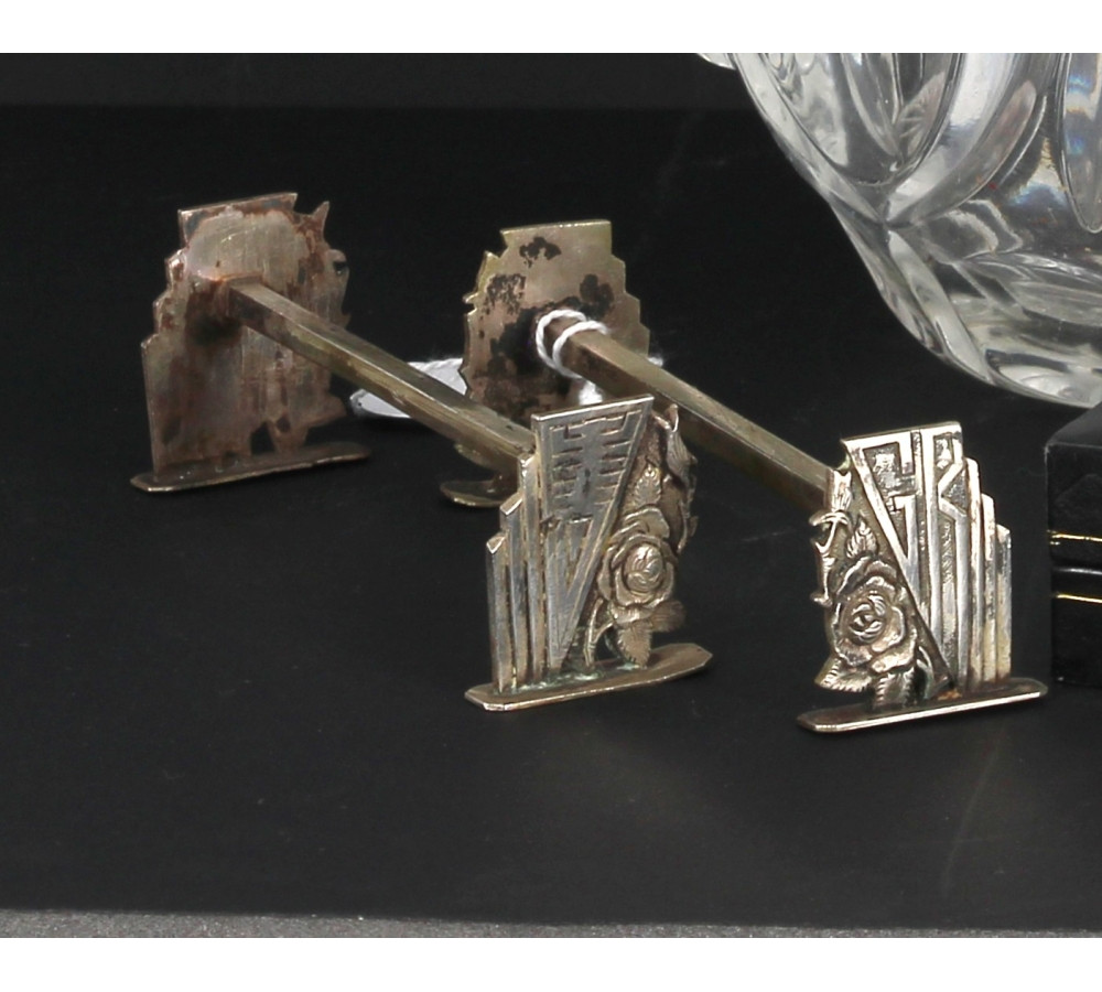 Broc à eau en verre moulé, H 20 cm : on y joint un ramasse-miettes en métal en coffret et 3 repose-couteaux en argent époque ART DECO (travail asiatique) poids 82.9 grs