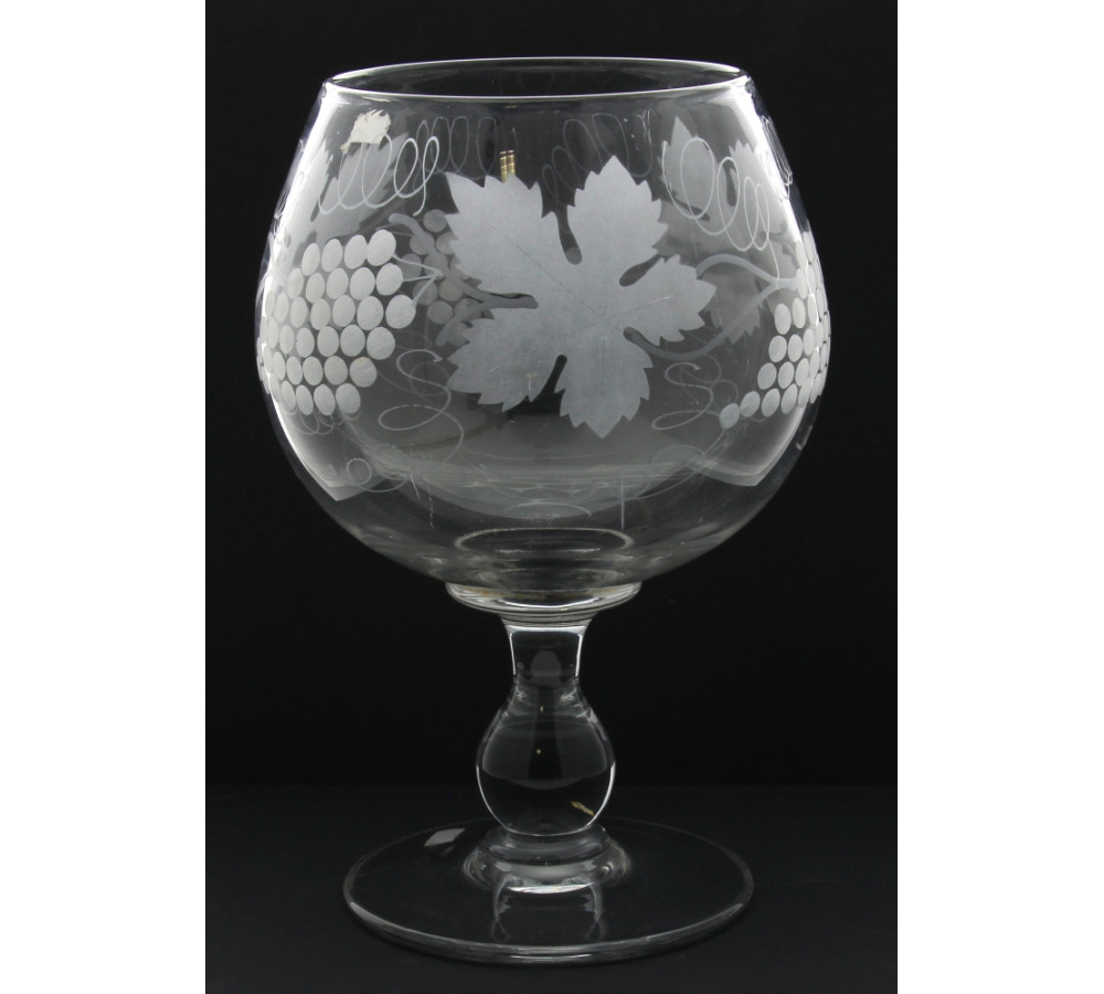 Important rince raisin sur piédouche en verre gravé à décor de pampres de vigne. H 34 cm